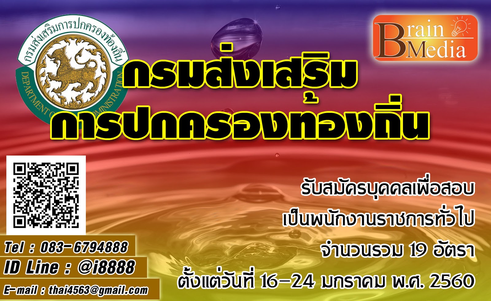 กรมส่งเสริมการปกครองท้องถิ่น รับสมัครบุคคลเพื่อสอบเป็นพนักงานราชการทั่วไป ตำแหน่ง พนักงานวิเคราะห์นโยบายและแผน และพนักงานวิชาการศึกษา จำนวนรวม 19 อัตรา ตั้งแต่วันที่ 16-24 มกราคม พ.ศ. 2560