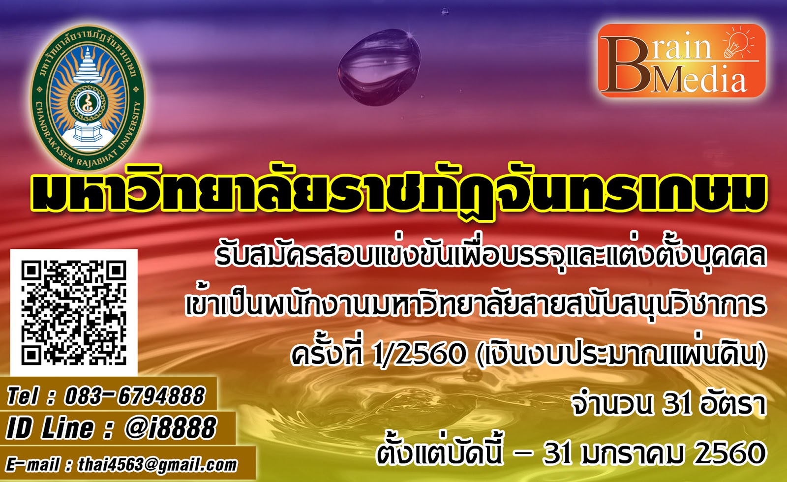 มหาวิทยาลัยราชภัฏจันทรเกษม รับสมัครสอบแข่งขันเพื่อบรรจุและแต่งตั้งบุคคลเข้าเป็นพนักงานมหาวิทยาลัยสายสนับสนุนวิชาการ ครั้งที่ 1/2560 (เงินงบประมาณแผ่นดิน) จำนวน 31 อัตรา ตั้งแต่บัดนี้ - 31 มกราคม 2560