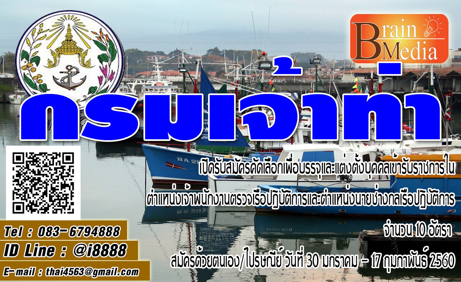 ประกาศ กรมเจ้าท่า เปิดรับสมัครคัดเลือกเพื่อบรรจุและแต่งตั้งบุคคลเข้ารับราชการในตำแหน่งเจ้าพนักงานตรวจเรือปฏิบัติการและตำแหน่งนายช่างกลเรือปฏิบัติการ จำนวน 10 อัตรา สมัครด้วยตนเอง/ไปรษณีย์ วันที่ 30 มกราคม - 17 กุมภาพันธ์ 2560