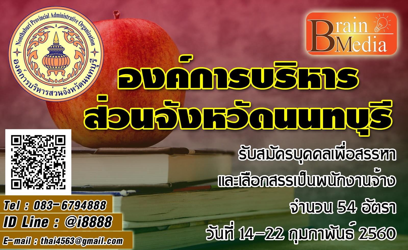 องค์การบริหารส่วนจังหวัดนนทบุรี รับสมัครบุคคลเพื่อสรรหาและเลือกสรรเป็นพนักงานจ้าง จำนวน 54 อัตรา วันที่ 14-22 กุมภาพันธ์ 2560