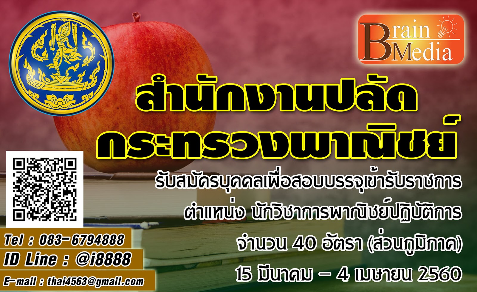 สำนักงานปลัดกระทรวงพาณิชย์ รับสมัครบุคคลเพื่อสอบบรรจุเข้ารับราชการ ตำแหน่ง นักวิชาการพาณิชย์ปฏิบัติการ จำนวน 40 อัตรา(ส่วนภูมิภาค) ตั้งแต่วันที่ 15 มีนาคม - 4 เมษายน 2560