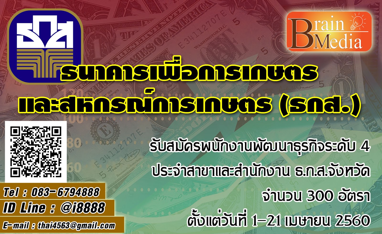 ธนาคารเพื่อการเกษตรและสหกรณ์การเกษตร รับสมัครพนักงานพัฒนาธุรกิจระดับ 4 ประจำสาขาและสำนักงาน ธ.ก.ส.จังหวัด ปีบัญชี 2560 จำนวน 300 อัตรา วุฒิ ปริญญาตรี-ปริญญาโท สมัครได้ทางอินเทอร์เน็ต ตั้งแต่วันที่ 1-21 เมษายน 2560