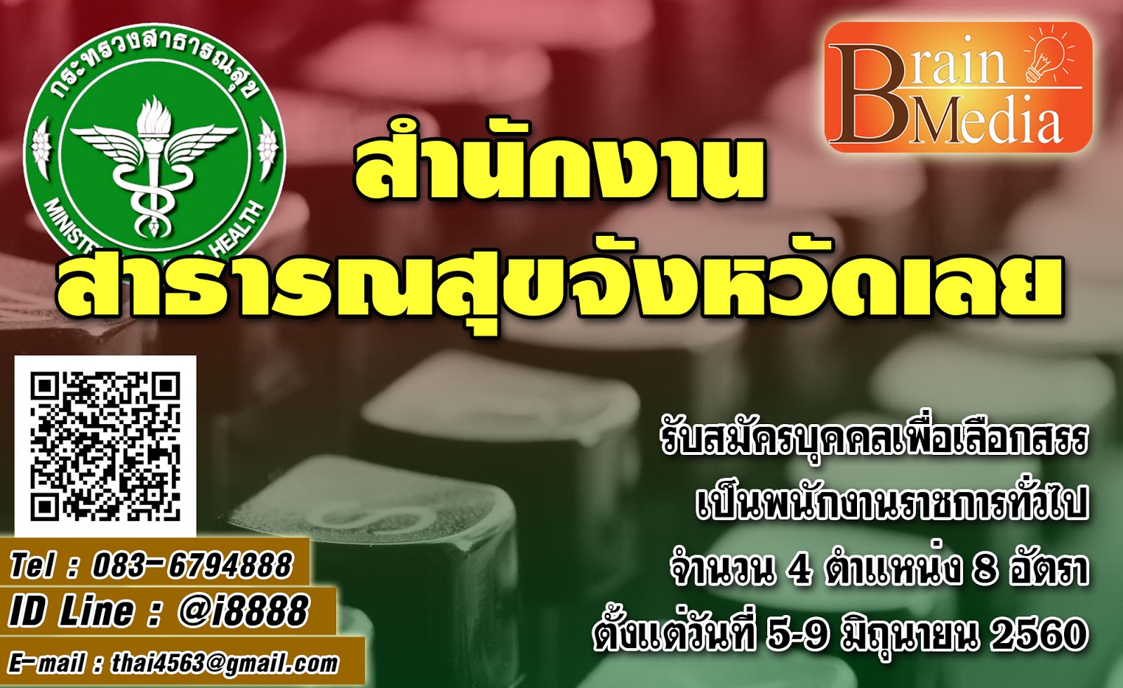 สำนักงานสาธารณสุขจังหวัดเลย รับสมัครบุคคลเพื่อเลือกสรรเป็นพนักงานราชการทั่วไป จำนวน 4 ตำแหน่ง 8 อัตรา ตั้งแต่วันที่ 5-9 มิถุนายน 2560