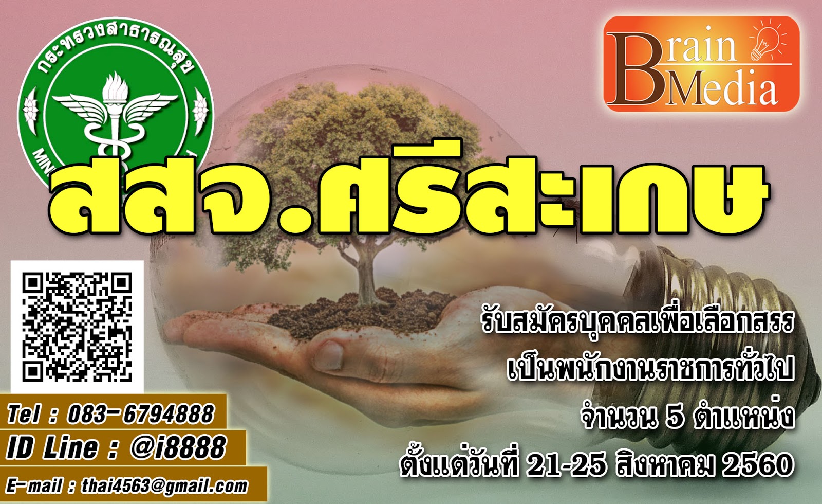 รับสมัครระหว่างวันที่ 21 - 25 ส.ค. 60 ณ กลุ่มงานทรัพยากรบุคคล ชั้น 1 สำนักงานสาธารณสุขจังหวัดศรีสะเกษ