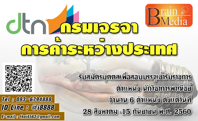 กรมเจรจาการค้าระหว่างประเทศ รับสมัครบุคคลเพื่อสอบบรรจุเข้ารับราชการ ตำแหน่ง นักวิชาการพาณิชย์ จำนวน 6 ตำแหน่ง ตั้งแต่วันที่ 28 สิงหาคม -15 กันยายน พ.ศ. 2560