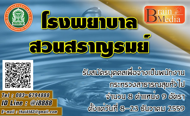 โรงพยาบาลสวนสราญรมย์ รับสมัครบุคคลเพื่อจ้างเป็นพนักงานกระทรวงสาธารณสุขทั่วไป จำนวน 8 ตำแหน่ง 9 อัตรา ตั้งแต่วันที่ 8-23 ธันวาคม 2559