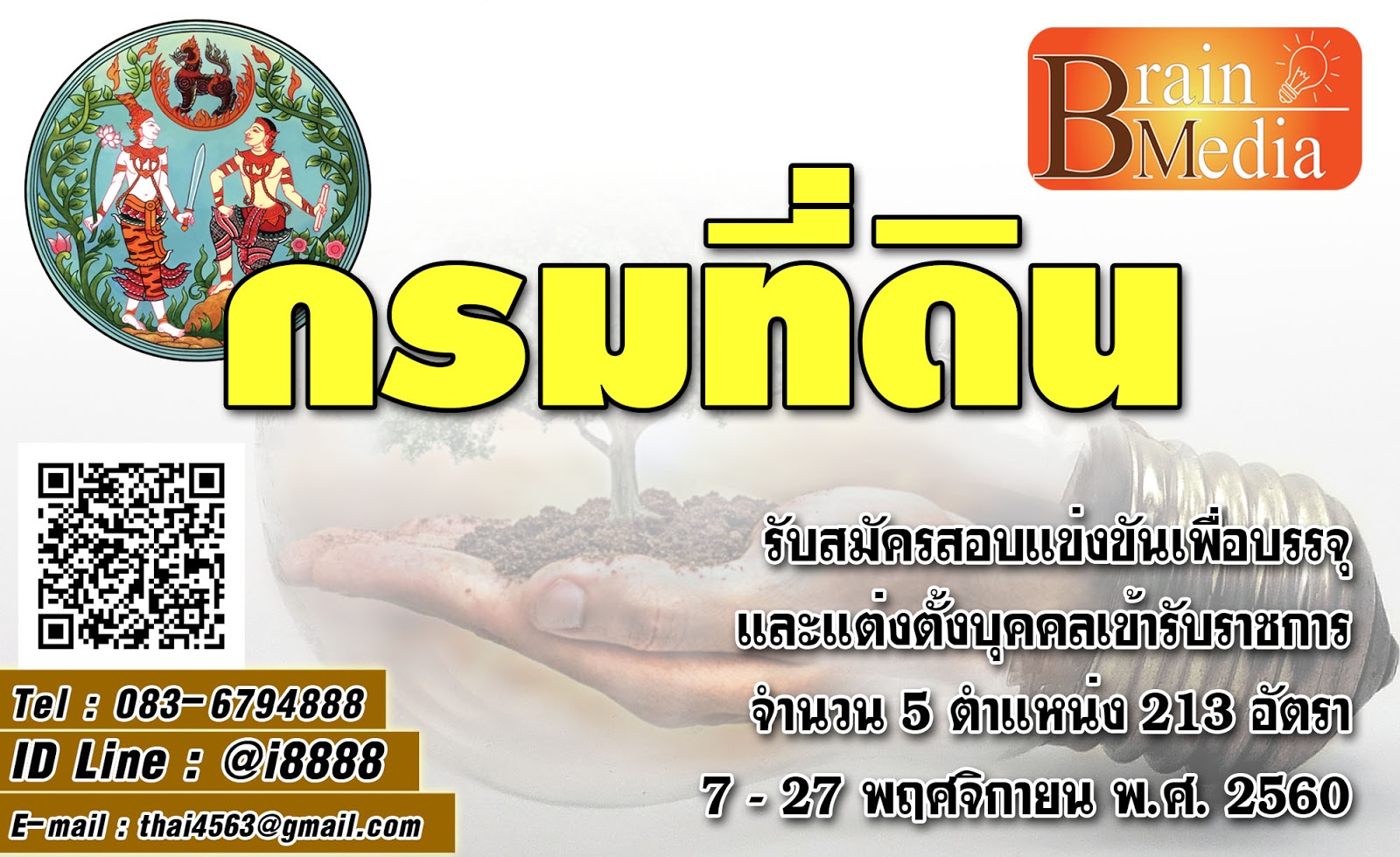 กรมที่ดิน รับสมัครสอบแข่งขันเพื่อบรรจุและแต่งตั้งบุคคลเข้ารับราชการ จำนวน 5 ตำแหน่ง 213 อัตรา สมัครออนไลน์ตั้งแต่วันที่ 7 - 27 พฤศจิกายน พ.ศ. 2560