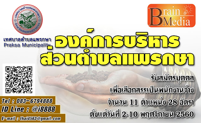 องค์การบริหารส่วนตำบลแพรกษา รับสมัครบุคคลเพื่อเลือกสรรเป็นพนักงานจ้าง จำนวน 11 ตำแหน่ง 28 อัตรา ตั้งแต่วันที่ 2-10 พฤศจิกายน 2560