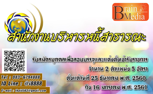สำนักงานบริหารหนี้สาธารณะ รับสมัครบุคคลเพื่อสอบบรรจุและแต่งตั้งเข้ารับราชการ จำนวน 2 ตำแหน่ง 5 อัตรา ตั้งแต่วันที่ 25 ธันวาคม พ.ศ. 2560 - 16 มกราคม พ.ศ. 2561